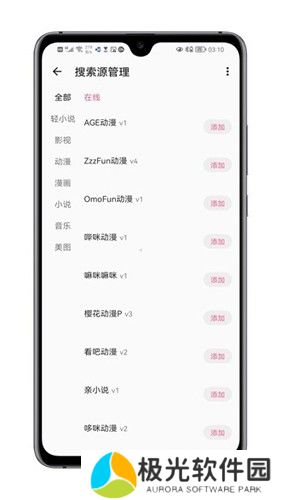2、此时用户可以看到软件内置了非常多的资源站,包含了漫画、小说、动漫、音乐、网盘搜索、轻小说等等,然后点击后面的添加按钮即可,添加的资源站越多软件中的资源就越丰富。