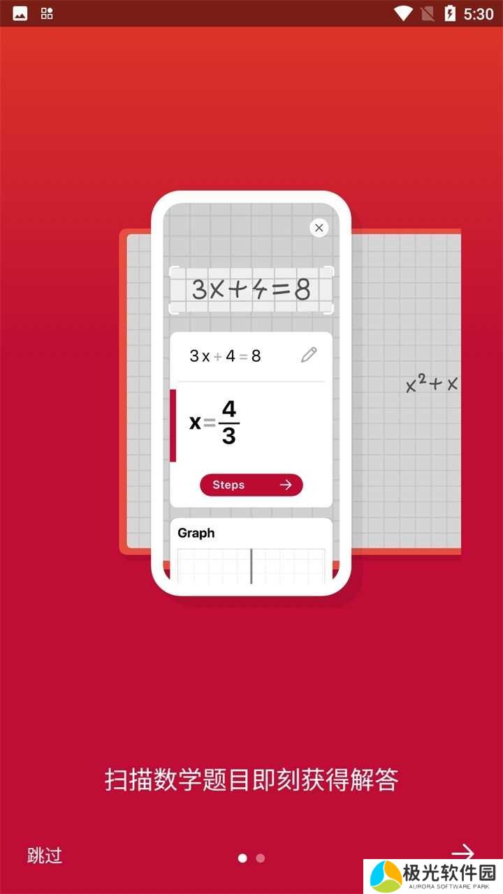 进入 App 简单的欢迎界面后,手机自动进入拍照模式,对准想解开的谜团就好,不用点任何按键,就能看到结果,点击下方的 Steps ,更可以知道解方程的过程。