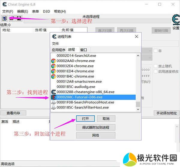 1、先翻开CE修正器附加一个游戏进程,如:cheatengine-i386.exe进程,操作过程如下