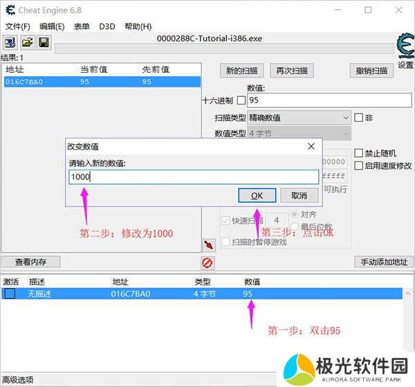 8、在数值95上面双击,并修改把 95 改成 1000 点击确定按钮,此时通关;