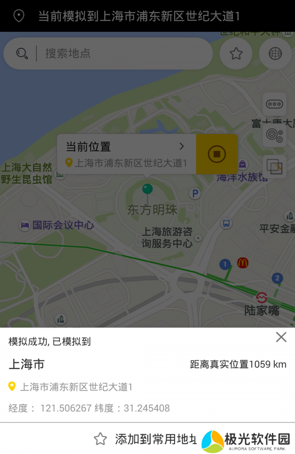 7、并不是用户目前的真实位置,这就是所谓的模拟定位,点击红色的图标禁用图标即可退出模拟定位;