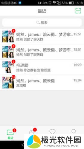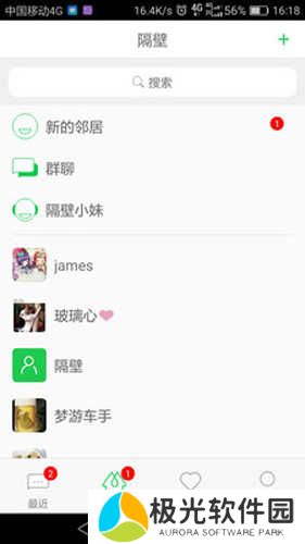 3、“隔壁”这个页面我们同一栋楼的住户会自动组建成一个群,这样我们就不会住了多年都不知道隔壁邻居是男是女了。右上角的“+”可以帮助我们寻找整个小区所有邻居,加为好友,经常联系。