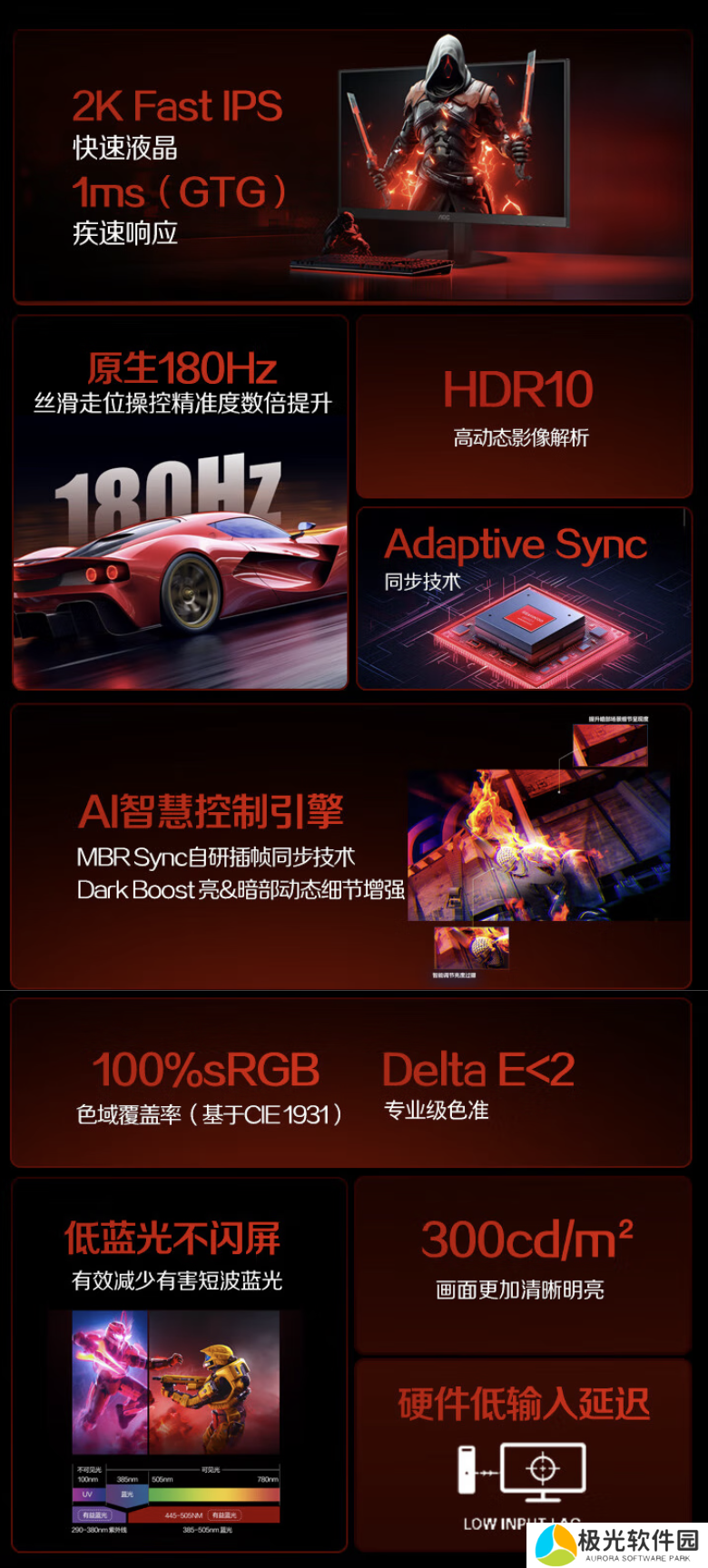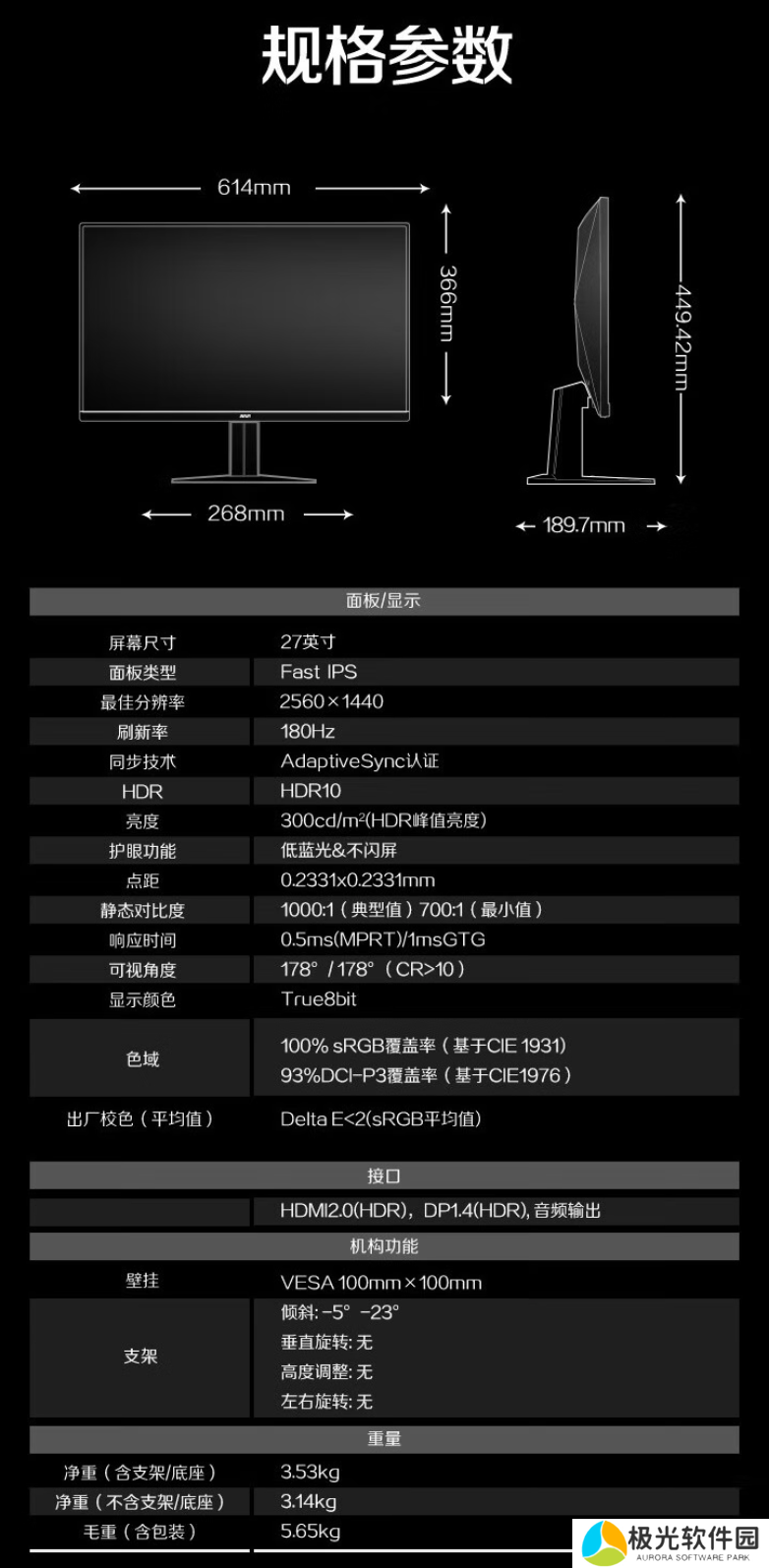这款显示器配备2560x1440分辨率原生180Hz Fast IPS面板,亮度300尼特,MPRT响应速度0.5ms,GtG响应速度 1ms,显示器支持8-Bit色彩,覆盖91% DCI-P3 色域。